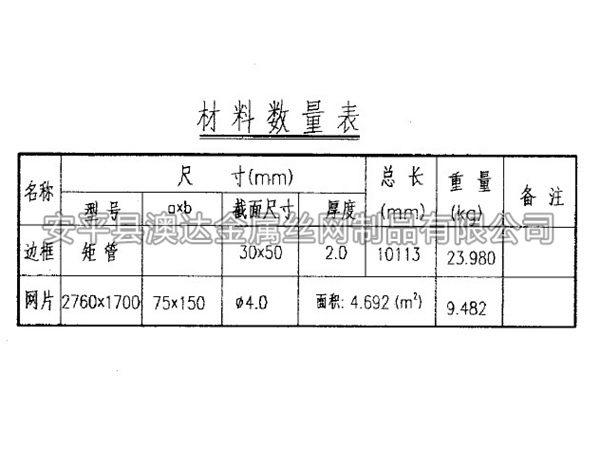 3.3金屬網片金屬網片采用Q235矩管邊框,規格30mm*50mm,矩管厚度2.0mm;內部網絲采用HPB3006.5mm高線鋼絲冷拔加工,規格75mm*150mm(¢4.0mm),上部向外折角30°,垂直高度300mm。