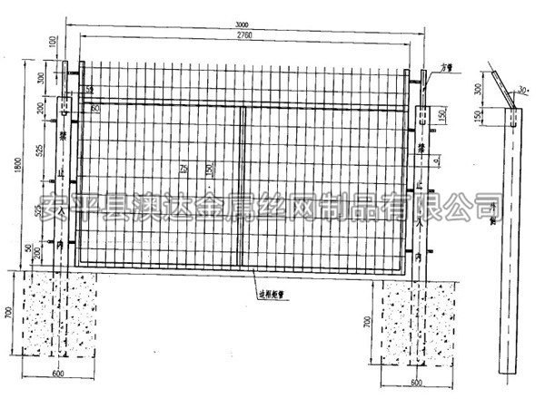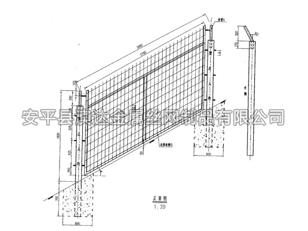 鋼筋混凝土立柱金屬網(wǎng)片防護(hù)柵欄可采用單開(kāi)門(mén)或雙開(kāi)門(mén)兩種形式。單開(kāi)寬度1.5m,雙開(kāi)寬度3m,其網(wǎng)片形式與防護(hù)柵欄保持一致,并通過(guò)銷(xiāo)鈾、銷(xiāo)鈾套與立柱連接。